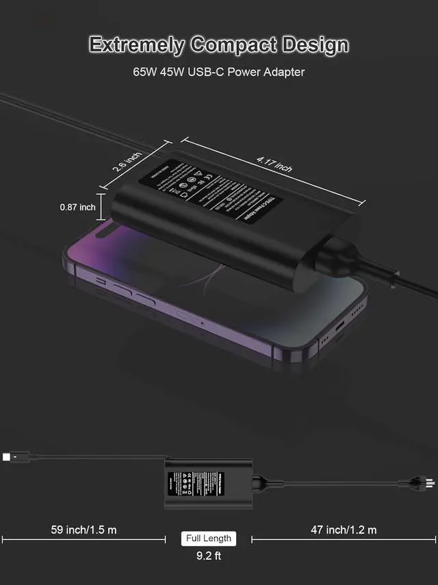 UNIVERSAL PORTABLE LAPTOP CHARGER: This 65W Universal USB C Laptop Charger is more compact than the iPhone 14 Pro Max. Perfect for taking with you when you travel or easily slipping into a briefcase