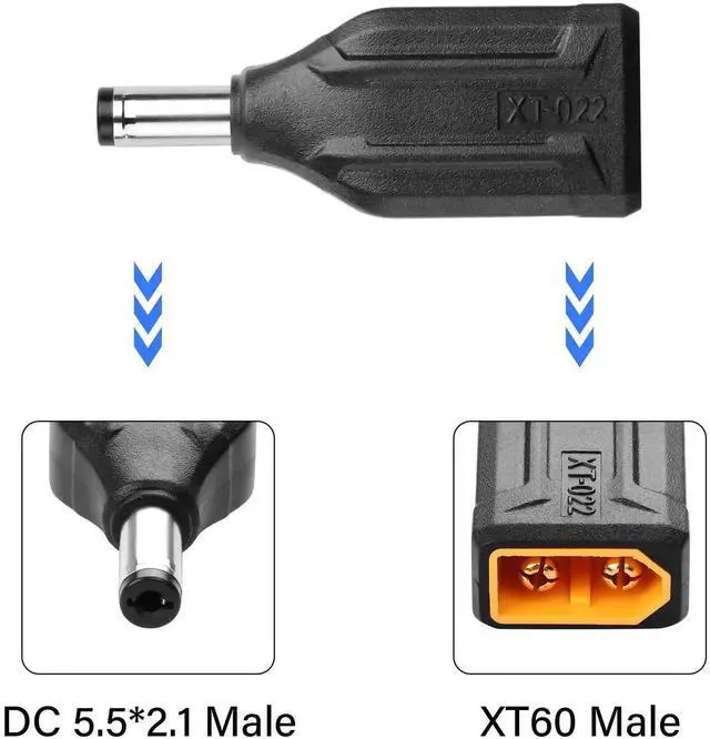 Connector 1: XT60 male. Connector 2: DC 5.5mm X 2.1mm male.
