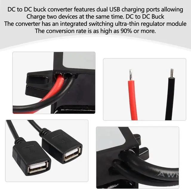 The 12V to 5V converter has dual USB female charging ports, which can charge 2 devices at the same time. The red wire is connected to the positive, and the black wire is connected to the negative. The DC-DC step-down converter integrates a switching thin voltage regulator module, and the conversion rate is as high as 96%.