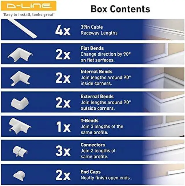 Each pack includes: 4x 39 D-Line Cord Cover Lengths & 12 Accessories. 1.18 in (Width) x 0.59 in (Height) x 39in Lengths (157in Total), 2x Flat Bends, 2x Internal Bends, 2x External Bends, 1x Equal Tees, 3x Connectors, 2x End Caps. Please note, alternative D-Line profile sizes are also available: 0.63 x 0.31 in, 0.78 x 0.39 in, 2x1in, 2.36 x 0.59 in & 0.87 x 0.87 in.