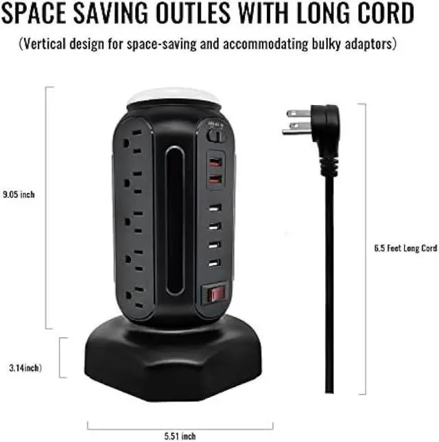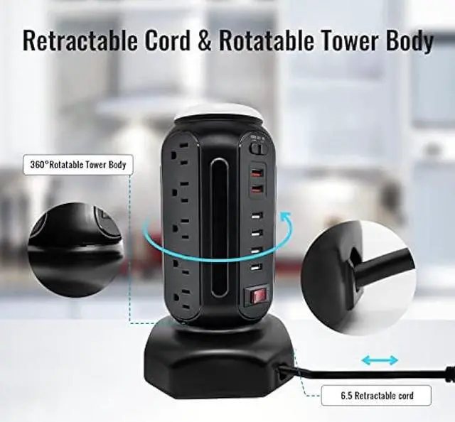 Retractable & 6.5FT Heavy-Duty Extension Cord The retractable extension cord in the tower base, with which you can pull out the needed length and leave the rest inside for better balance. And the surge protector tower with 6.5 feet extension cord solves the problem of our desk being far from the socket. You can use your device almost anywhere in the room because of the 6.5 feet cord.