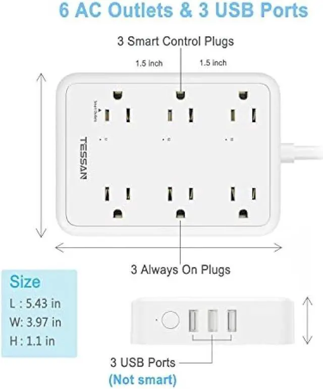 9 In 1: Smart surge protector includes 3 smart outlets and 3 always-on outlets, plus 3 USB ports (not smart). In addition, 3 USB ports will deliver the fastest charge speed up to 2.4A MAX of each but is not Qualcomm quick charge (total 5V 3A). FCC certified, made of fireproof PC+ABS material. It built in surge protection and can make it fireproof of up to 1382 to ensure your equipment is fully protected