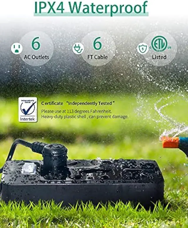 IPX4 Level Waterproof- The power strip has IPX4 waterproof and splash-proof standards, and adopts a unique structural design, which can resist rain, spray, and even water flow, which means that the plug board will not be damaged when water flows into the socket. It can be applied to various wet scenes, such as bathrooms, kitchens, terraces, aquariums or outdoor, courtyards, gardens, courtyards, terraces and decks.