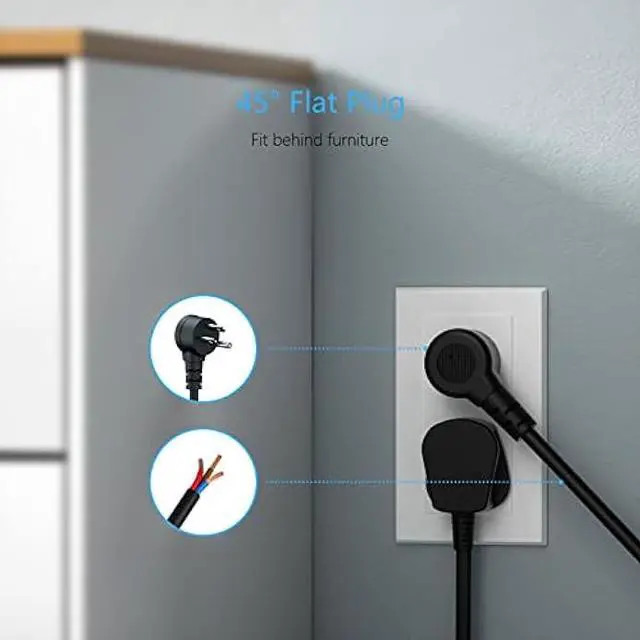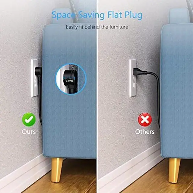 Narrow Space: 3 widely spaced outlets on different directions and 45 degree flat plug won't to take up any space and fit the narrow space.