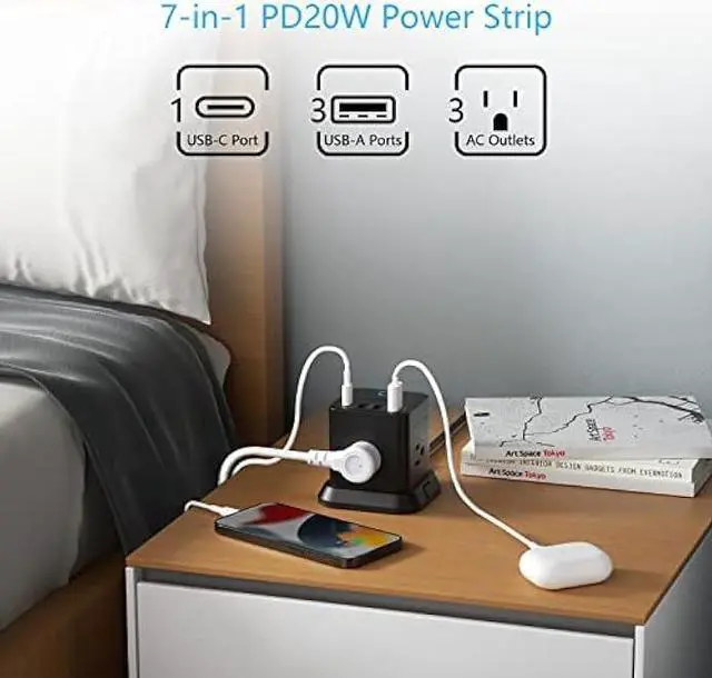 7-in-1 Power Strip with USB Ports: 3 outlets extender with 3 USB-A Ports and 1 USB-C PD 20W port to make full use of this power strip, charge multiple devices at once.