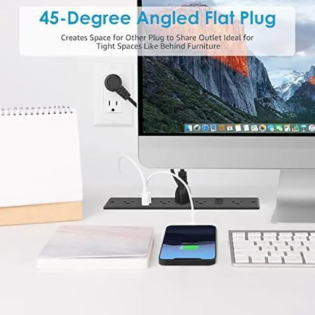 Recessed Surge Protection with Flat Plug: This plug design fit perfectly in tight spaces (such as behind furniture), the 45 degree plug creates space for other plugs and shared outlets. With 1200 Joules surge protection, the power outlet withstands spikes and fluctuations, protecting your electronics and home power from lightning and power surges.