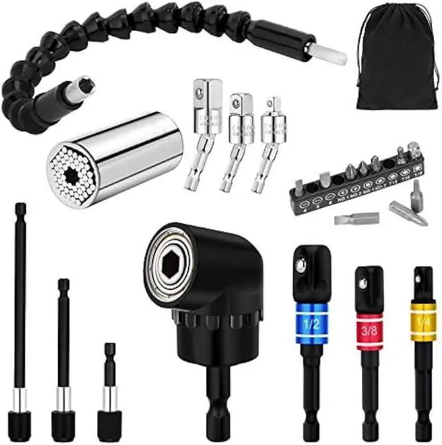 Flexible Drill Bit Extension Set 11.7 inch bendable drill bit extension can twisted and rotated at many different angles. It can be drilled into a small space, flexible installation work. Let our flexible drill bit extension tool help you solve more problems quickly. This tool sets is light and compact, drawstring pocket convenient to carry outside and store.