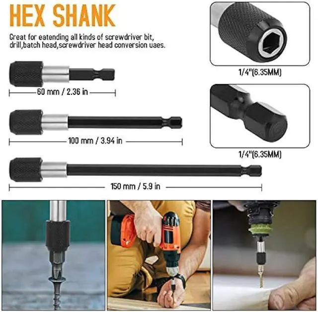 3pcs Drill Bit Holder1/4 Inch Hex Shank Magnetic Extension Collet Adapter Quick Release Rod Sleeve Screwdriver Bit Holder | 60mm/ 100mm/ 150mm length, suitable for screwdriver bits for electric, pneumatic screwdrivers and other power tools, with extended drill bits.