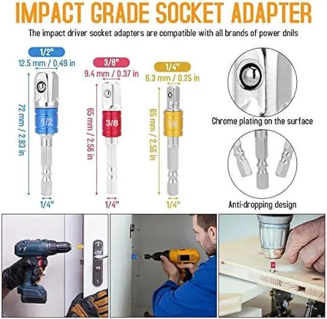 Universal Socket Adapter3pcs 1/4, 3/8, 1/2 each with 1/4 hex bit for all quick change chuck adapter systems: power tools/drilling tools/ Multifunctional nut driver kits such as hand tools, spring loaded ball bearing lock on socket kits.