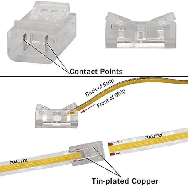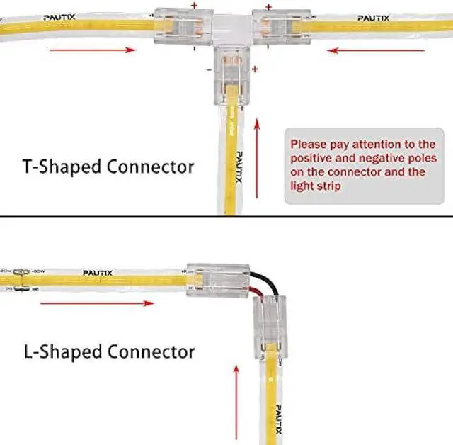 Solderless Extendable ConnectorsUsing this cob led strip extension kit you can extend your strip light's length to the power supply or connector, eliminating the issue of limited space. These accessories let you extend and connect light strips, extend the connection between the strip light and controller/power supply, and let you achieve a corner connection