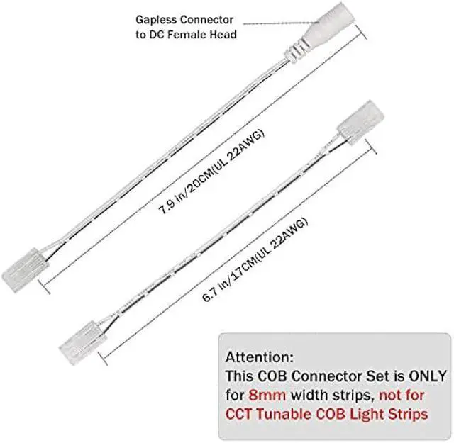 Compatible LightsThis installation accessories set is ONLY compatible with 8mm width COB LED Strip lights (Not applicable to 10 mm board width and CCT Tunable COB LED Strip Lights). The transparent middle connector will not block the light. Only compatible with 8mm wide COB strips, other sizes are not applicable