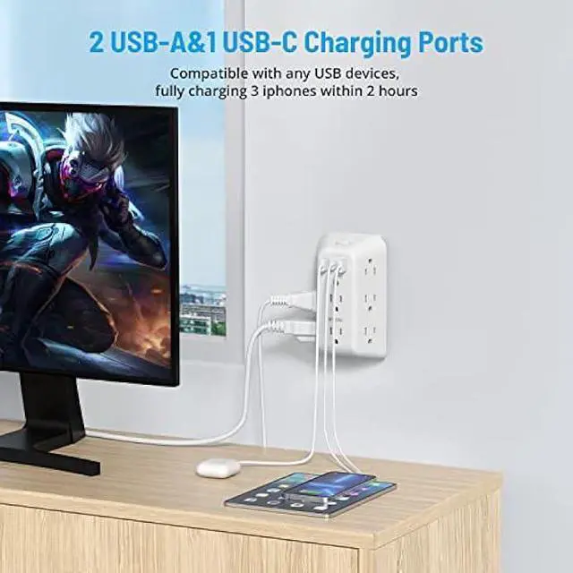 Wall Plugs with USB Ports: The extra plug wall outlet features 2 USB-A ports and 1 USB-C port. Each USB A port features 5V/ 2.4A Max output, and the USB C charging port features 5V/3A MAX. Built-in smart technology, detecting charging devices and delivering optimal charging speed automatically, compatible with most USB devices.