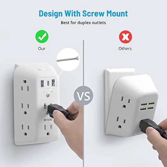 Multi Function Outlet Adapter: This wall plug extender comes with 8 AC outlets, 2 USB A ports and 1 USB C port. Fits duplex outlet perfectly, just plug in to use. The screw port helps hold the surge protector power strip tightly to the plug.