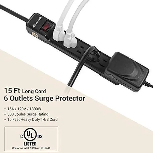 15 Ft Long Power Cord Electrical surge protector power strip with 15 foot extra long extension cord gives you flexibility to reach distant outlets and hard to reach places; SJT 14/3C gauge durable power cord is durable and wear resistant