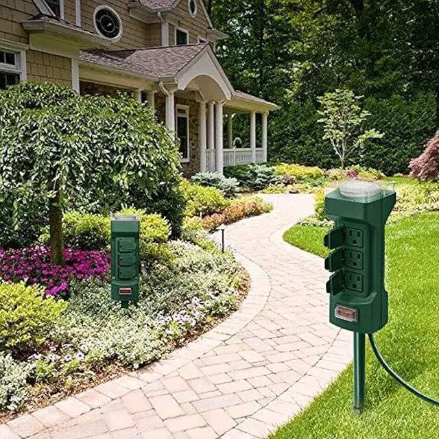 Multi Functions - The outlet stake timer is solid and durable made, lightweight, green color blends into your landscaping perfectly. The power strip can stand by itself via pushing the sharp stake into the lawns. Dust-proof and flexible. The stake is easily removed when you want to use the outlet box indoor. You can be automating your outdoor lights, sprinklers, fans or other appliances with this outdoor timer box.