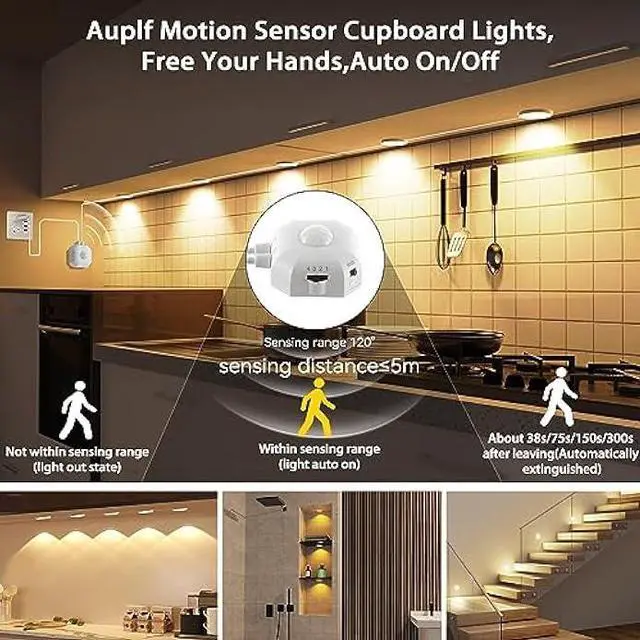 Motion Sensor Cabinet Light - Built-in PIR motion sensor, Auplf motion sensor under cabinet light made of 6 puck lights can be light up automatically when it detects human movement, and turn off automatically after 38/75/150/300 seconds of leaving. Sensing range 16.4 ft. Convenient and efficient, no extra hands to turn on entire kitchen lights.