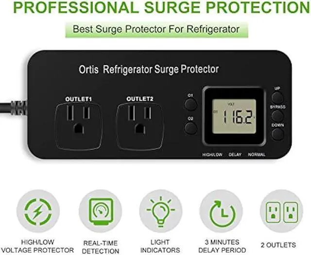 Refrigerator Surge Protector, Ortis Double Outlet Electronic Surge Protector for Home Appliances with Time Delay & Real-Time Electricity Usage Monitor, Protects All Voltage Abnormalities