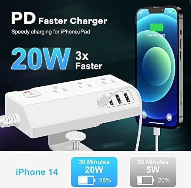 20W USB C Fast Charger for iPhone iPad- Desk clamp power strip coming with a USB C to Lightning fast charging cable for charging your iPhone and iPad via the usb c port (Max Output 20W) with up to 3x faster speed, it only takes half an hour to charge your iPhone up to 60%, which will save 1.5 hours for you compare with the normal 5W charger