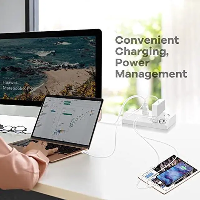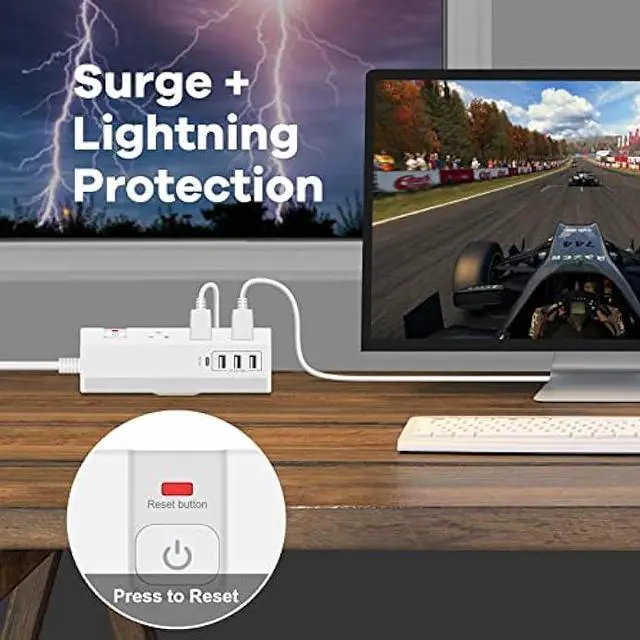 Power Strip with Surge Overload Protection- This usb c power strip was built-in multiple protection to protect your devices against spikes and fluctuation, with integrated circuit breaker for overload protection of all outlets. This surge protector also has over-current, over-voltage, short-circuit over-heating protection to ensure the safety of your electronics