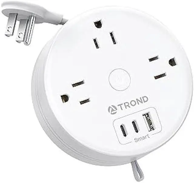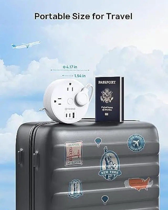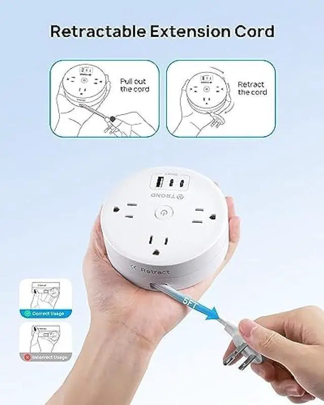Compact & Portable Power StripThe 5ft flat power cord is retractable for easy storage. You can pull out and retract the cord very smoothly and pull it out partially or fully according to your needs. The retractable extension cord is easy to use, safer, and looks less messy. The compact and round shape helps to save your precious luggage space and makes a great travel companion for you on the road. (Diameter: 4.17 in, Thickness: 1.54 in)