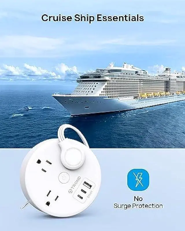 Cruise Ship EssentialsThis cruise power strip is cruise compliant with No Surge. Power strips with surge protection are not allowed on cruise ships for safety reasons. This cruise approved power strip solves your problem of using appliances on a cruise. For cruise lovers, it's a lifesaver. Compliant with major cruise lines such as Carnival, Royal Caribbean, Princess, Disney, and more.