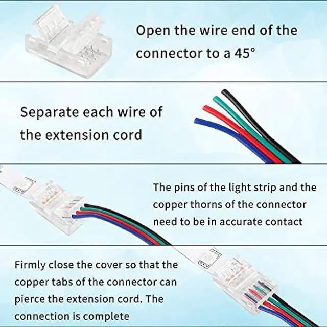 Perfect combination: LED connectors contains 10 pack of rgb led connectors and a 16.4 ft extension cord. Suitable for 4 Pin 10mm wide waterproof and non-waterproof light strips.