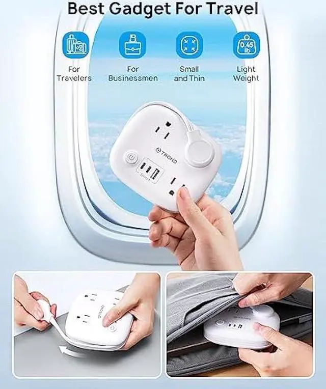 Wrapped Around Power StripWith a 2.6 ft wrap-around cord, the travel power strip is designed as a carry-on compact size( 4.6 * 4.0 * 1.1 in), of which the thickness is thinner than all other extension cords. Its minimalist design helps to save your luggage space for travel or fits in a computer bag easily on business trips. It must be a great travel companion on the go!
