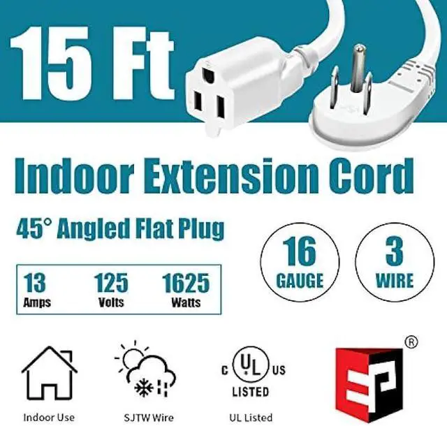 Flat Plug - This extension cord plug is 45°angled to fit into a top outlet without blocking the bottom outlet and flat to fit easily behind furniture.
