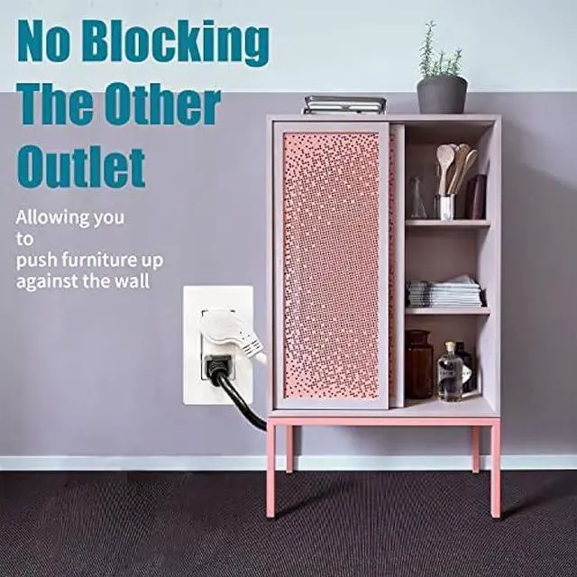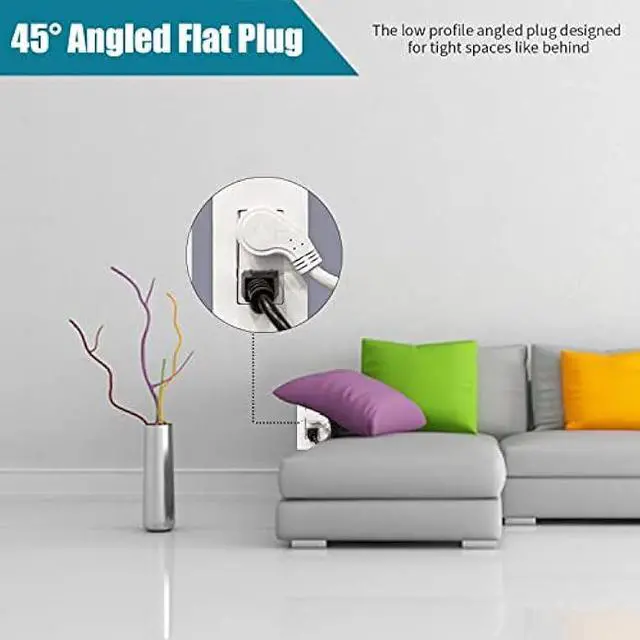 Space Efficient - The low profile angled plug is designed for tight spaces like behind furniture, bookshelves, desks or anything which is close to the wall not allowing you to use the standard outlet.