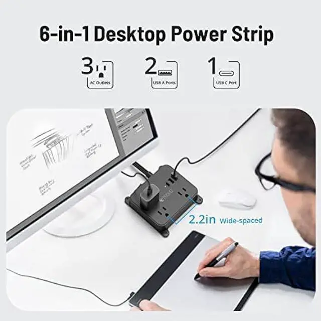 Compact and Wide-Spaced: The outlet extender designed with an enlarged distance( 2.2 inches) between outlets is perfect to plug larger power adapters without blocking other outlets, suitable for the home, office, college dorm room, and travel. Also, you can use the On/Off switch to control the USB ports and outlets of this desk power strip.
