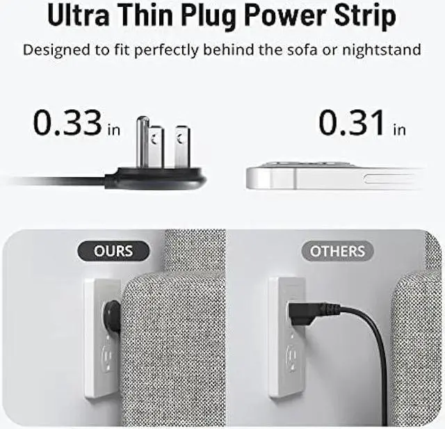 Flat Extension Cord: With only a 0.33 -inch ultra flat plug design, TROND upgraded flat wall plug is thinner than the regular flat plugs, which can easily fit in tight spots and hide behind the furniture, sitting flush against the wall completely. And the 10ft slim cord is much thinner than the standard round power bar to run smoothly under the carpet and door gap.
