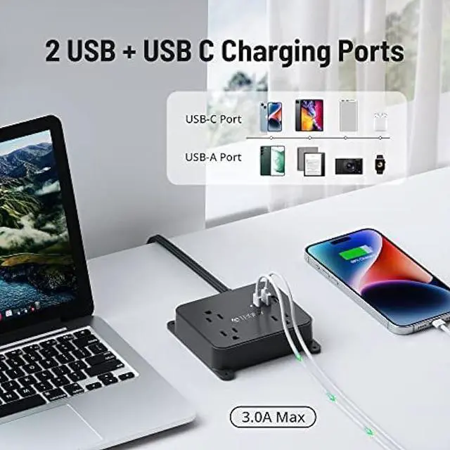 FT: The power strip has multi plug outlets. With 3 AC outlets and 2 USB A and 1 USB C ports, it turns 1 socket into multiple outlets and could charge up to 6 devices simultaneously. The USB C port can charge up to 3.0A, ideal for cell phones, power banks, laptops, earphones, etc.
