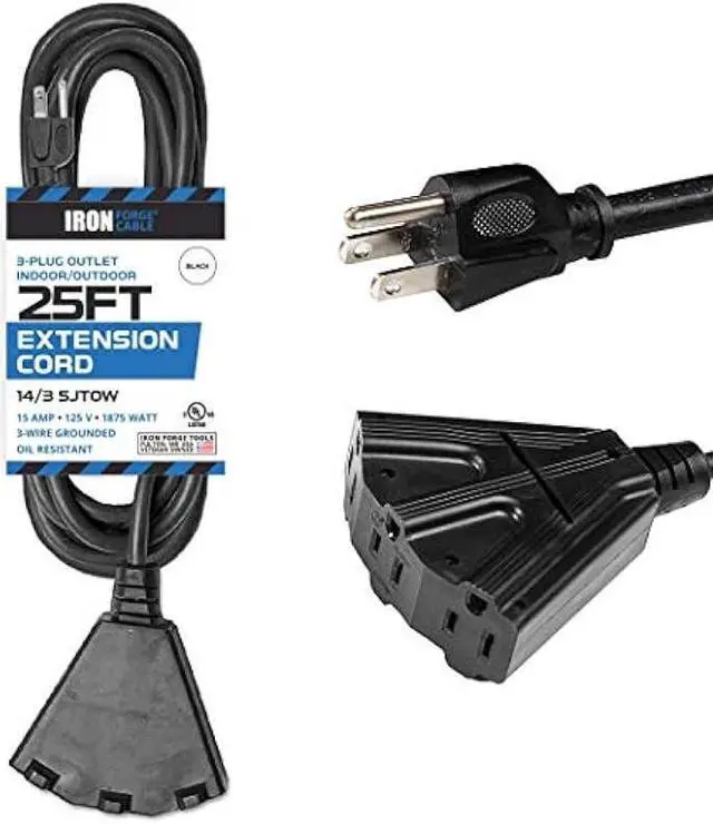 UL LISTED: This UL-listed 25 ft multi outlet extension cord features a 3-wire grounded plug and 3 outlets in a pigtail/power block/triple tap style. 15 amp, 125 volt, 1875 watt, 5-15P/R, UL Listed.