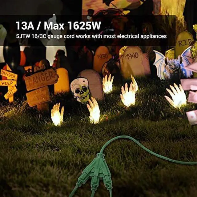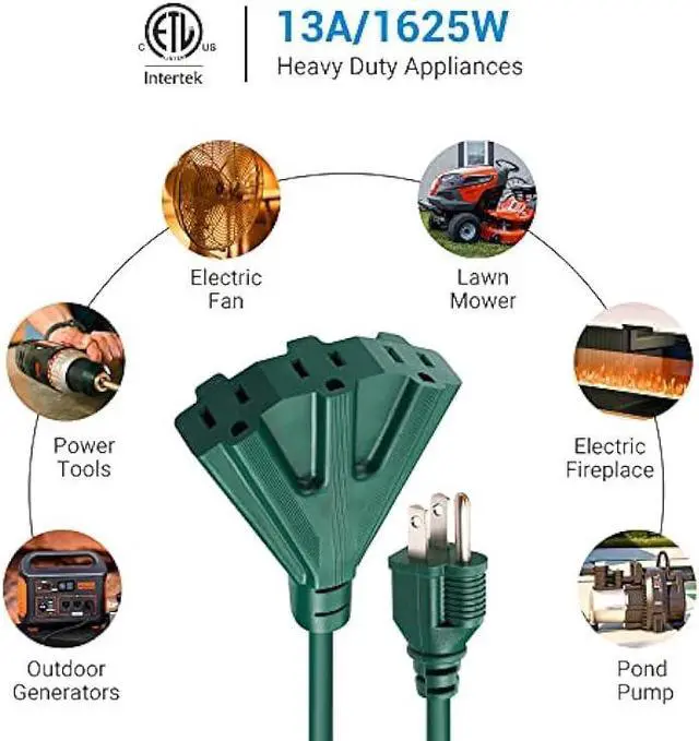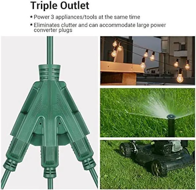 [For Indoor & Outdoor] The Tri-Tap extension cord splitter passed thousands of times bending and plugging tests without fear of heat and cold, perfect for outdoor lighting, Christmas decor, lawnmowers, snow removal tools, heaters, and household appliances; its green double jacket looks invisible under your Christmas tree