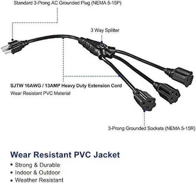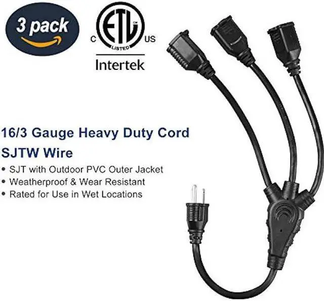 HEAVY DUTY CONSTRUCTION: Thick 16AWG 13A power cord splitter is built with all-copper wire, reinforced blades, and double jacketed cords; features full-molding design to withstand a lifetime of wear and tear; certified to ETL