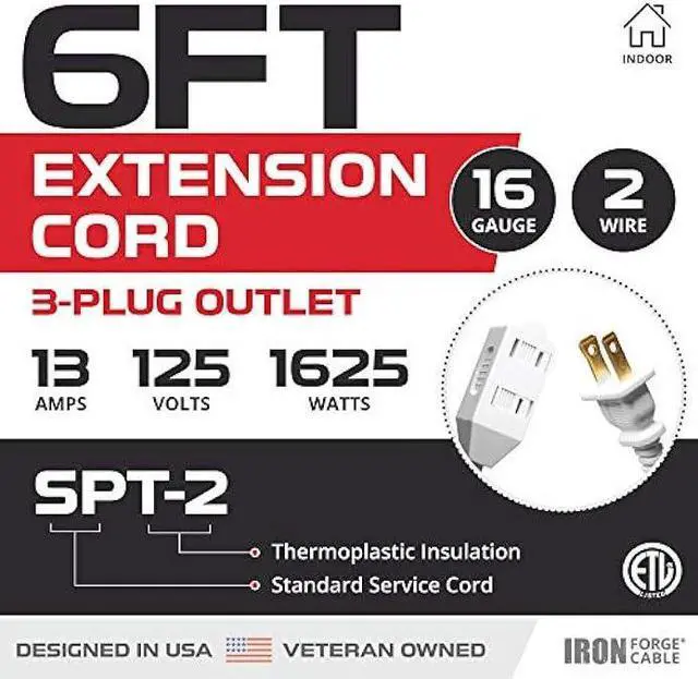 DURABLE STRAIN RELIEF for optimal performance. ETL Listed. 16 gauge, 2 prong, 6 foot, 13 amp, 125V, 1625 watt.
