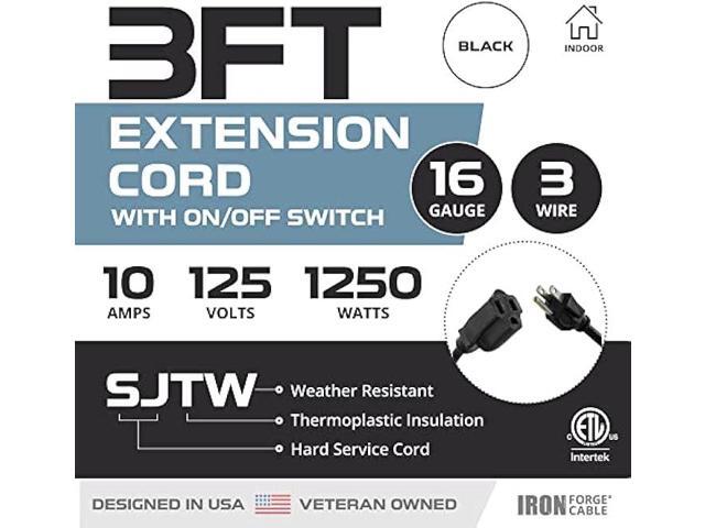 - ETL LISTED, VETERAN OWNED - 3 wire extension cord with switch on/off, 3 foot, 16 AWG/16 Gauge, 10 amp, 125V, 1250 watt, outdoor rating SJTW for cord. Temperature Range: -40°F to +140°F.