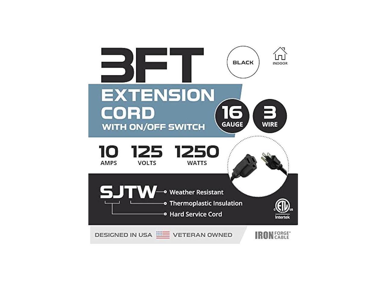 IRON FORGE CABLE Inline Extension Cord with On-Off Switch 3 FT, 16/3 SJTW Power Switch with 3 Prong - Black Household Outlet Electrical Switch 10 AMP for Indoor & Outdoor - ETL Listed