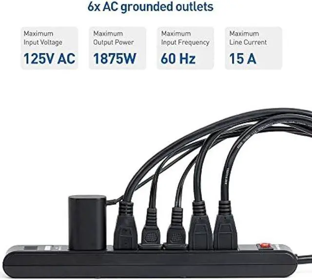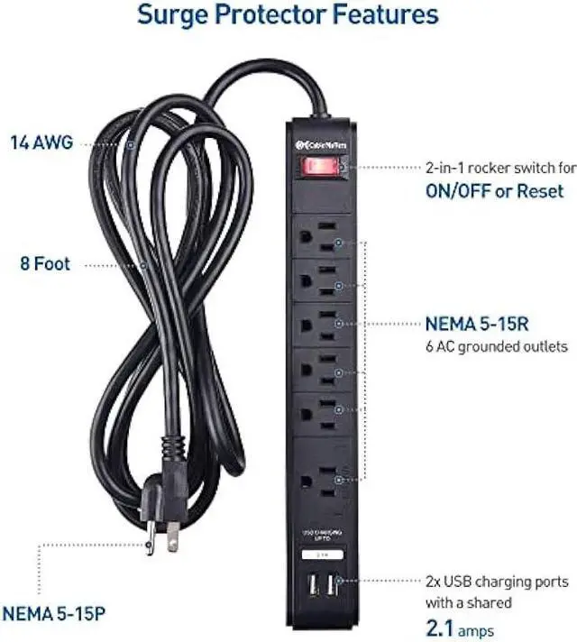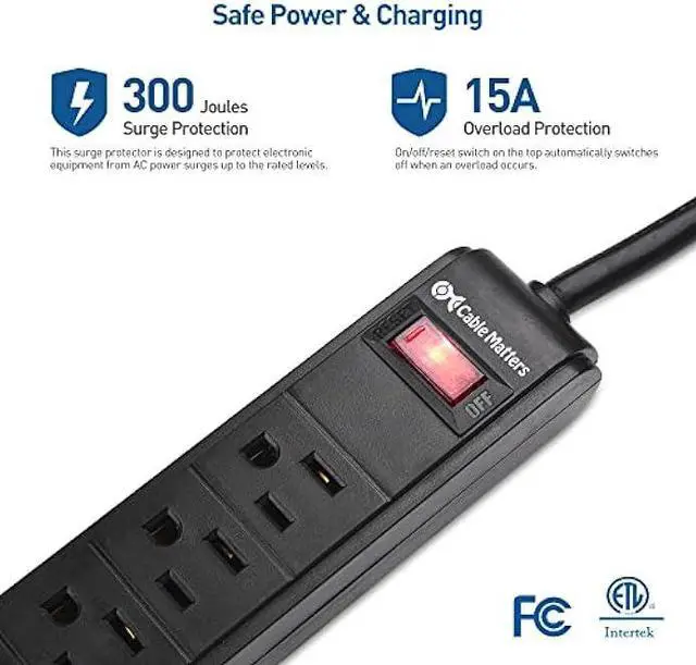 Heavy duty extension cords with 14 AWG wire and a 15 Amp / 1875 Watt power rating; Reliable surge protection of this outlet strip with USB ports provides a 300 joules suppression rating to protect up to five connected devices; Power-saving ON/OFF switch provides a quick way to turn off equipment when not in use; 15 amp braided power strip long cord with a circuit breaker that shuts off when excessive current is detected