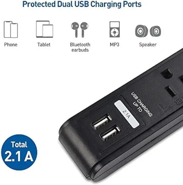Dual USB 2.1A charging portson the surge suppressor are located at the end of the strip for easy access; Use the power surge protector to protect your valuable mobile devices while charging with safe USB ports