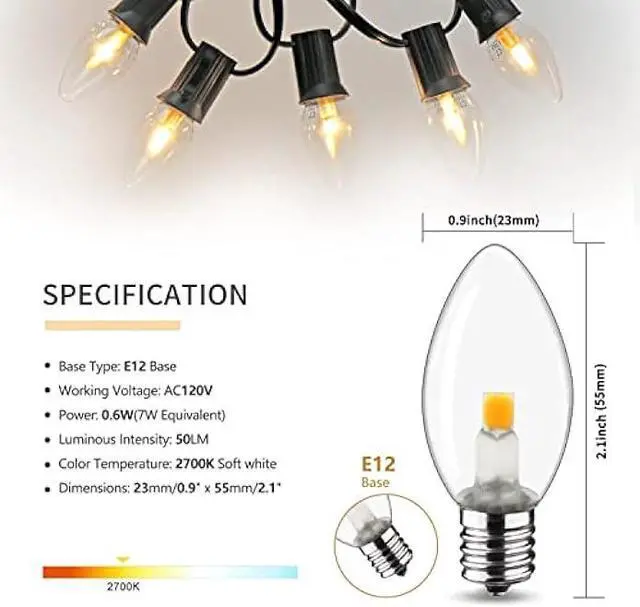 Safe and Energy-saving Safe and Energy-saving Bulbs: 4 count C7 clear LED bulbs 0.6W C7 led bulbs with C7/E12 candelabra base light bulb is 2700K warm white, non-dimmable, C7 night light bulbs is made of glass, C7 clips light perfer for decoration for your village houses, pumpkin, craft etc.