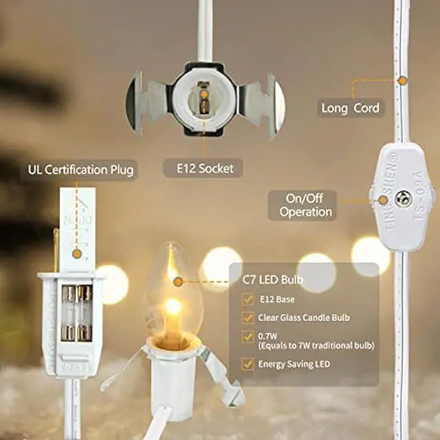 UL ListedAccessory cord with warm white C7 light bulb UL Listed for indoor use, perfer for salt lamps, plug in night light, Christmas villeag houses, Halloween pumpkins, bedroom, living room, Bar, Cafe, Shop, craft house decoration and lighting, adding a warm atmosphere to your holiday.