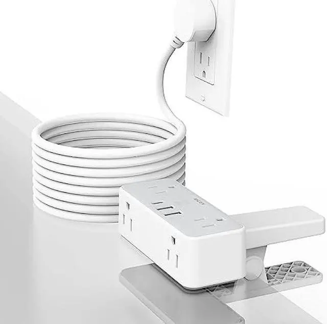 6 Feet Extension CordThis desk mount power strip is long enough to make it more flexible. Flat plug design indoor extension cord can fit easily in tight spaces, such as desk, nightstand. 45 degree right-angle create enough room makes this power strip flat plug does not obstruct other plugs, suitable for installing behind sofa, wardrobe, bookshelves, and other furniture.