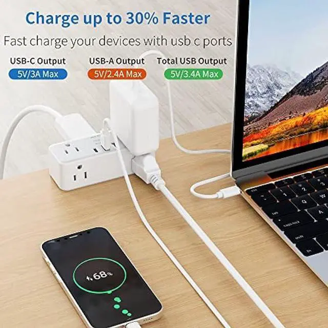USB ChargingThis multi plug outlet including 3 USB ports to meet your multiport charging demands. Dual USB-A ports can charge up to 2.4A, and the USB-C port can charge up to 3A; Total USB ports output is 5V/ 3.4A, 17W max; Ideal for cell phone, tablet, power bank, camera, etc.