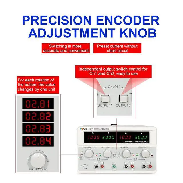 4 Encoder Adjustment Knobs: MATRIX variable dc power supply says goodbye to the hassle of coarse and fine adjustments by 4 precise encoder knobs, every time you turn the knob, the value changes by 1 unit. Our dc bench power supply also has protection so that if the knob is touched unconsciously, the value does not change.