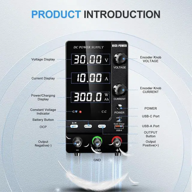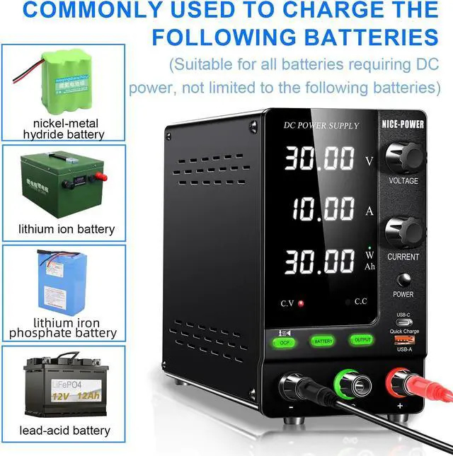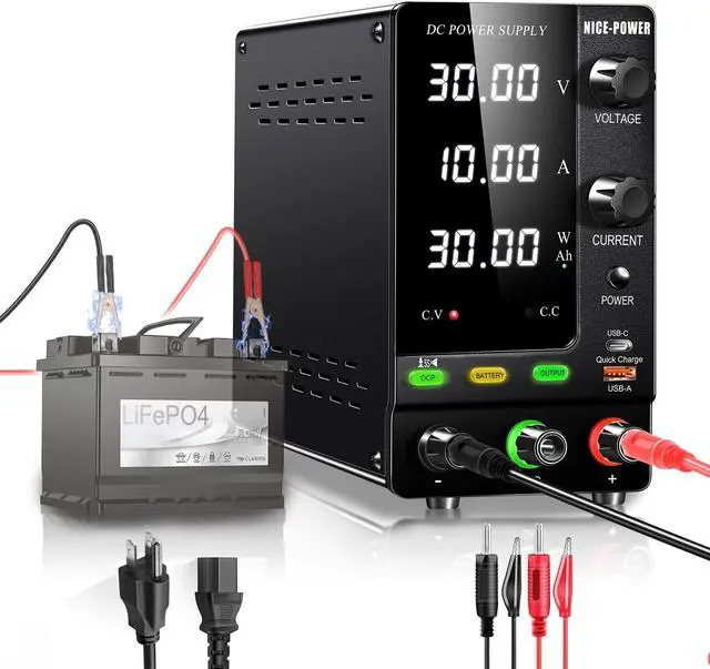 Multi protection, Fast charging and Displaying Charging Ampere-hour: The Bench power supply has a maximum rated voltage of 30V, which can charge your 6V/12V/24V battery. With a maximum rated current of 10A, it can bring a maximum power output of 300W, quickly replenishing your battery's power. It also adds multiple protection functions such as over temperature protection, over current protection, and short circuit protection,and in Battery mode, the actual charging ampere-hour is shown on the display (green light lighting under the Ah character), allowing you to charge with more peace of mind