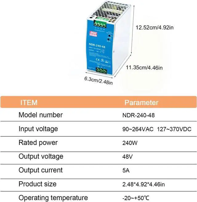Compact 48V Power for Electromechanical Equipment: NDR-240-48 DIN Rail Power Supply Designed for small electromechanical equipment like compact actuators and motors, the NDR-240-48 delivers a reliable 240W at 48V/5A. Ensure consistent performance and minimize downtime with this robust power solution. Space-Saving Integration: The slim design and DIN rail mounting maximize space within your equipment, ideal for tight integrations. Reliable in Harsh Environments: Built for demanding industrial conditions, ensuring consistent performance for your critical equipment. Equipment Protection: Comprehensive safeguards against short circuits, overload, over-voltage, and over-temperature protect your valuable investment. Simplified Installation: DIN rail mounting simplifies installation and maintenance, saving you time and effort. Key Features: 240W output at 48V/5A Slim design DIN rail mounting Wide operating temperature range Comprehensive protection Universal AC/DC input UL508, BS EN/EN62368-1 compliant High efficiency up to 90% Active PFC Power your electromechanical equipment with the reliable and efficient NDR-240-48.