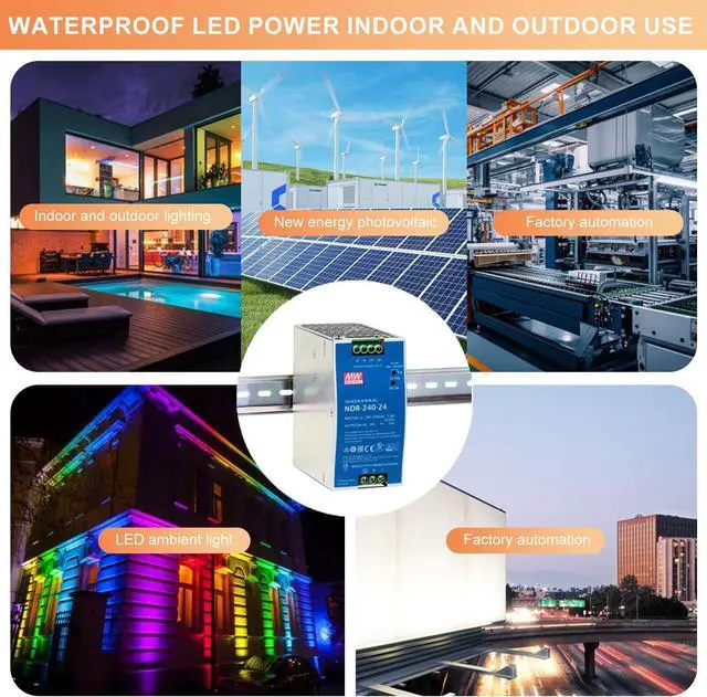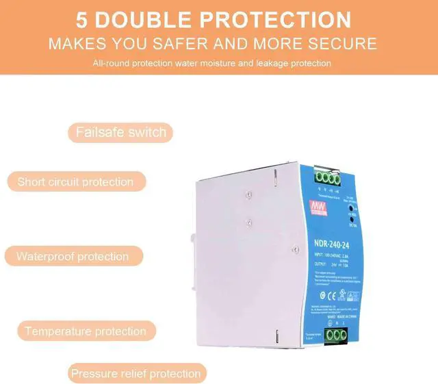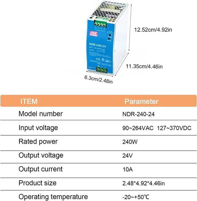 Powering Compact Machines: NDR-240-24 24V DIN Rail Power Supply Designed for small electromechanical equipment like compact packaging machines and label printers, the NDR-240-24 delivers a reliable 240W at 24V/10A. Ensure consistent performance and minimize downtime with this robust power solution. Space-Saving Integration: Its slim profile and DIN rail mounting maximize available space within your equipment, ideal for space-constrained applications. Reliable in Demanding Environments: Built to withstand harsh industrial conditions, the NDR-240-24 ensures consistent performance for your critical equipment. Equipment Protection: Comprehensive safeguards against short circuits, overload, over-voltage, and over-temperature protect your valuable equipment and prevent costly damage. Easy Installation & Maintenance: DIN rail mounting simplifies installation and maintenance, saving valuable time and effort. Key Features: 240W output at 24V/10A Slim design DIN rail mounting Wide operating temperature range Comprehensive protection features Universal AC/DC input UL508, BS EN/EN62368-1 compliant High efficiency up to 88.5% Active PFC function Optimize your small machine power with the reliable and efficient NDR-240-24.