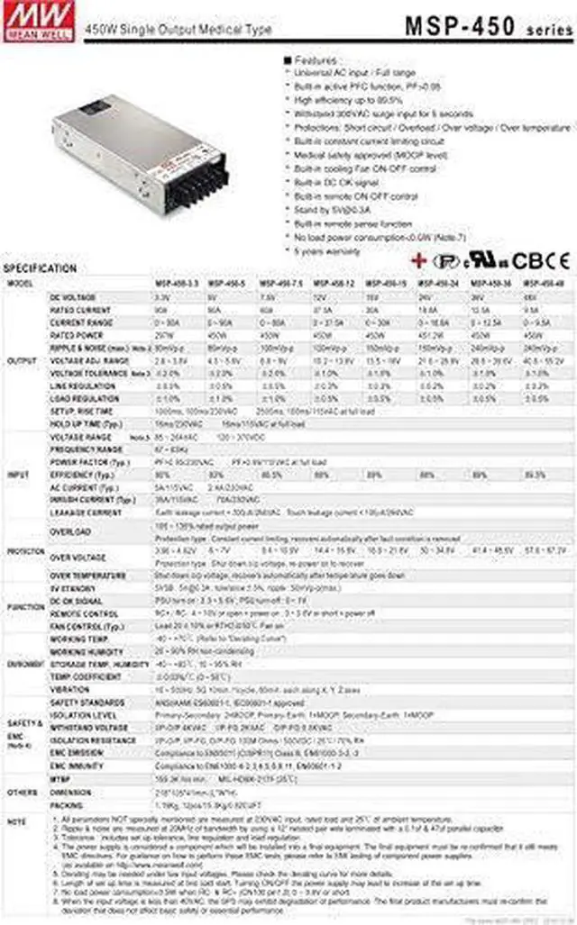 Through medical safety regulations (MOOP level (Operator Grade) ) medical use of built-in chassis type power. The built-in active power factor correction circuit (PFC) is beneficial to improve energy utilization and reduce harmonic interference, high efficiency, low load < 0.6W and low leakage. ^^Output 450W 12V 37.5A. ^^Original and Genuine, We can check the serial number on the meanwell website. ^^We don't believe in cheap and cheerful. Reasonable price to ensure quality and service. Buy it now, save time, save life. ^^This item will ship MSP-450-12*1pcs, enjoy shopping and best wishes!
