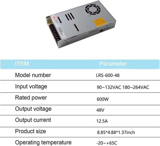 The DrapeMania LRS-600-48 is a 600W single-output enclosed power supply with a compact 1U (1.61 inch) low-profile design. It accepts 115VAC or 230VAC input (selectable via switch) and delivers a stable 48V, 12.5A output. With 92% efficiency and a built-in fan, the LRS-600-48 operates reliably from -4°F to +149°F. This power supply is designed for demanding industrial environments, featuring 5G vibration resistance and high-altitude operation (up to 16,400 ft). Comprehensive protection features (short circuit, overload, overvoltage, over-temperature) ensure long-lasting performance and reliability. The LRS-600-48 is a cost-effective solution for various industrial applications, including automation machinery, control systems, and electronic equipment.
